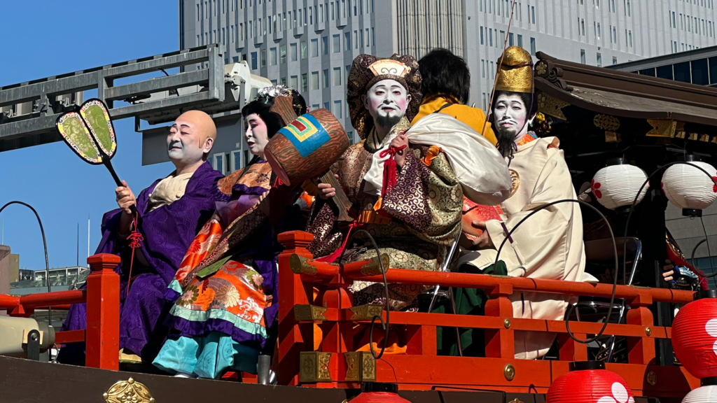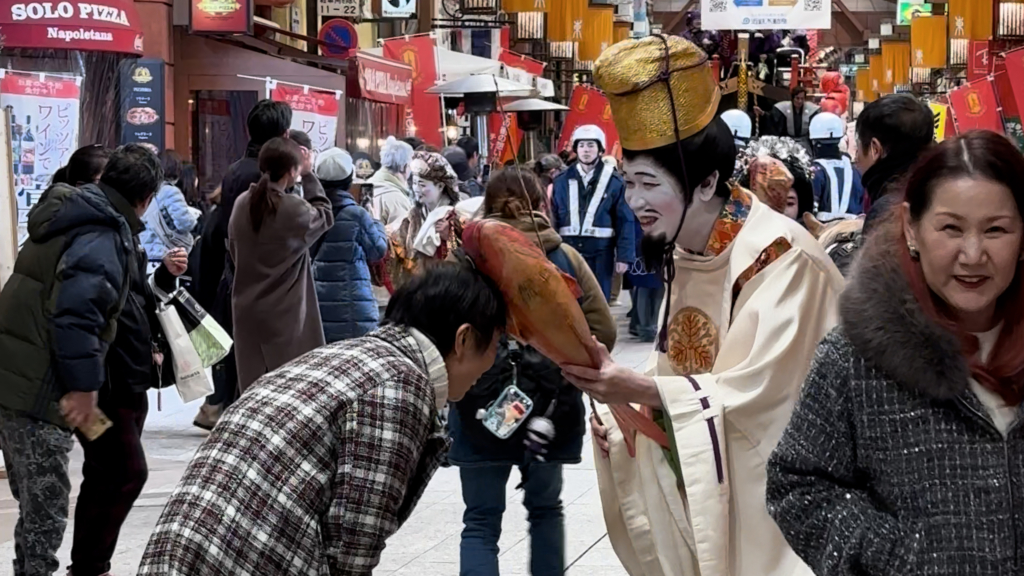 名古屋の中心地・栄(さかえ)から大須観音まで、七福神を乗せた豪華な宝船「大須丸」が街を華やかに練り歩きました。 沿道には多くの市民や観光客が集まり、濱地扮する恵比寿様が笑顔で福を振りまくと、街全体が温かな活気に包まれました。地域の方々との直接的な交流は、この行事の大きな醍醐味となっています。