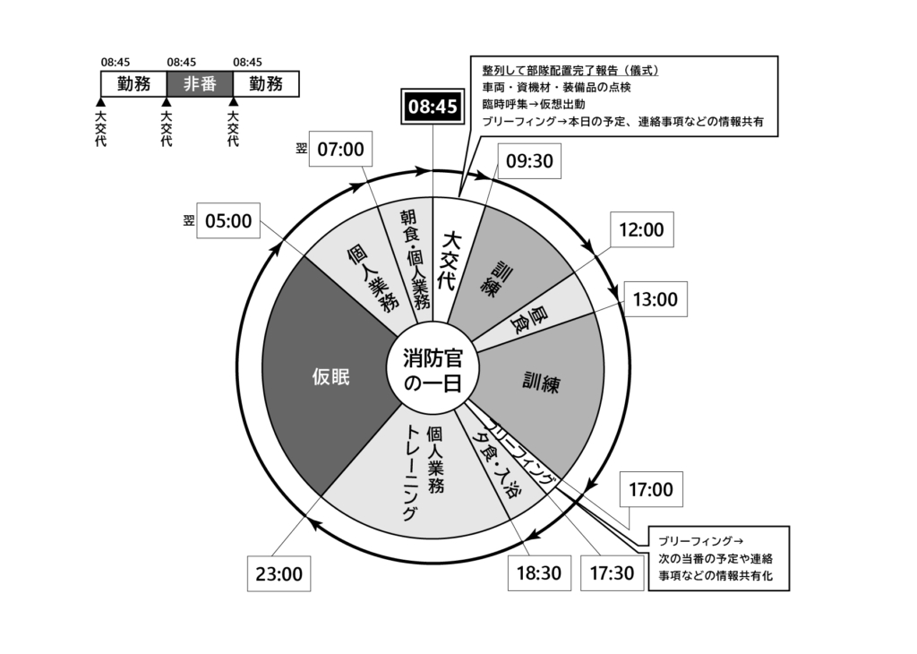 交代勤務に就く消防官の一日( 例) は次のとおりです。